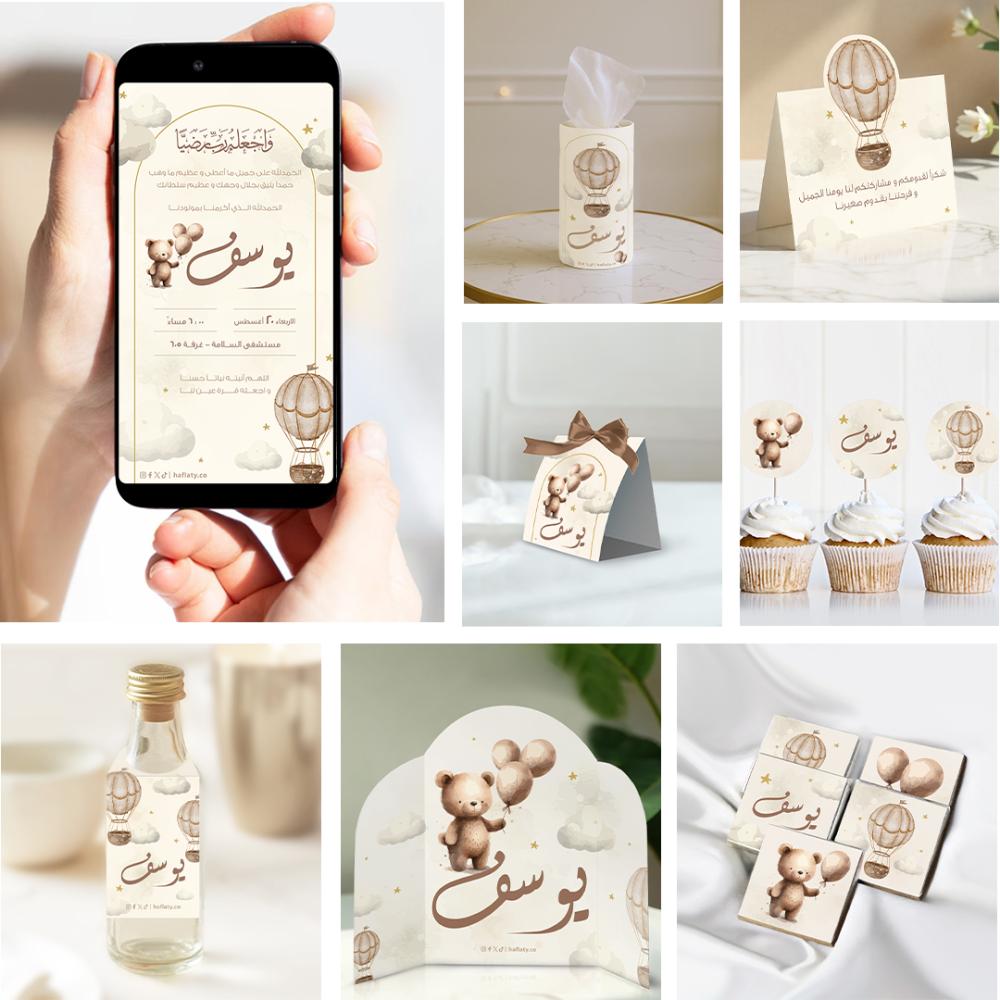 ثيم متكامل أنيق بقطع متميزة وطباعة بجودة عالية، يكفي لـ 12 أشخاص ، عند الطلب يصلك الثيم مطبوع جاهز للاستخدام لتنسيق مناسبتك. المنتج عبارة عن 12 قطع من كل تصميم من الثيم (مثال: 12 لبادة طاولة ، 12 كروت الصحن ،12 تغليف قارورة المياه تعليق،.... الخ). جميعها جاهزة للاستخدام والتنسيق بجميع المرفقات اللازمة للغرس، اللصق أو التعليق.
